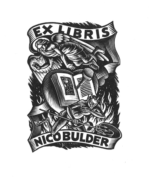 Nicolaas Johannes Bernardus (Nico) Bulder (Hoogezand, 10/29/1898 – Groningen, 1/30/1964) was a Dutch artist of many talents. Although he used various printmaking and painting techniques, he became best known by his wood engraving work especially for ex libris (bookplates) and novel illustrations. For school books illustrations, he primarily used the scratchboard technique. Later in his life he painted more. His 1955 version of the Apocalypse is especially impressive.