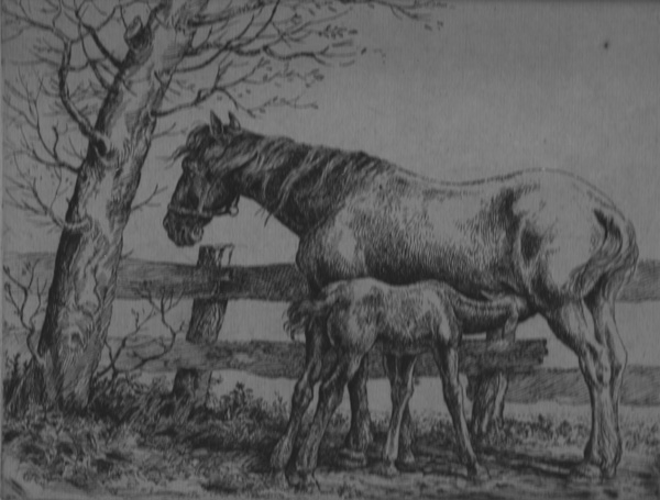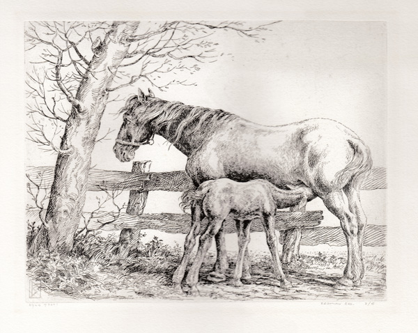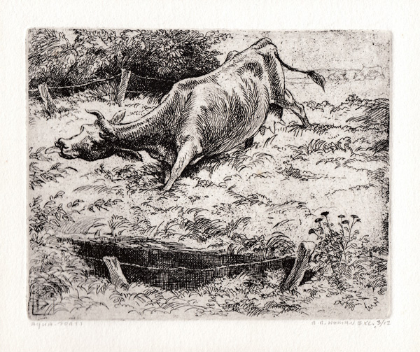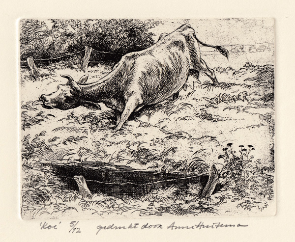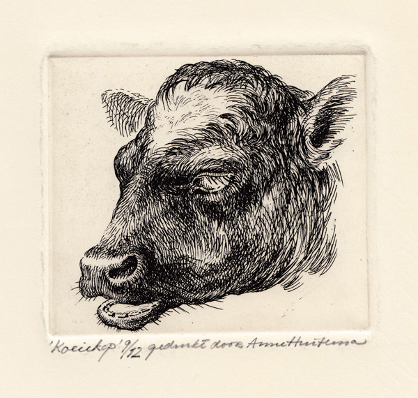 Mare with her colt (“veulen”) reprint by Reinder HomanMare with her coltDead hare, pencil drawing, 1938, 21 cm x 27.5 cm, collection FraeylemaborgHorseman with his dog, year unknown, but before 1957, etching on zinc plate, artist’s own print, never printed afterwardsDetermined Cow (“Reikhalzende Koe”), etching, post 1958, reprinted posthumously by Anne Huitema.Determined Cow (“Reikhalzende Koe”), etching, post 1958, reprinted posthumously by Reinder Homan.Stone litho of a determined Groninger cow. “Reikhalzende koe”, own proof, reprinted posthumously.Cow Head, etching, post 1958, posthumously printed by Anne Huitema.Pegasus, wood engraving, 1963, from “In Memoriam Arthur Rimbaud” by Julius de Boer and Nico Bulder.Taras Boeljba, 1948, cover page and page 1831939: Colt. “Veulen”The Cricket and the Ant” (“De Krekel en de Mier naar La Fontaine”) –Click for more info.1930: Tail piece, “slotvignet”, small crab1930: Tail piece,”slot vignet”, donkey at tree