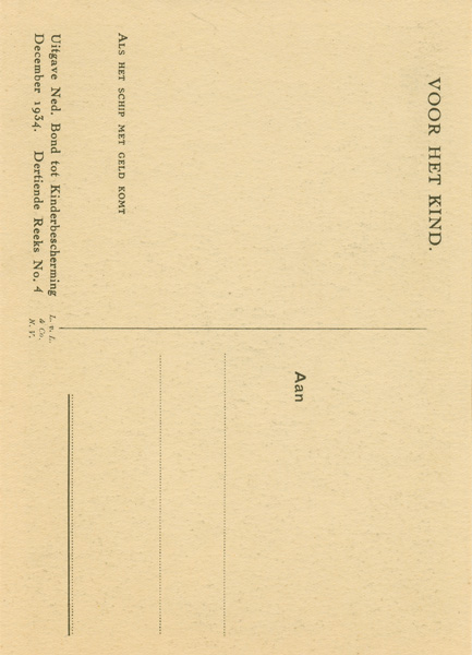 Rear side of Christmas card, December 1934If/when the money ship arrives (“Als het schip met geld komt”)A shower of best wishes for 1935 (“Een regen van goede wenschen voor 1935”)Three Kings (“Driekoningen”) 1934 (“voor het Kind” series)Christmas Eve “Kerstnacht”, 1934 (“voor het Kind” series)