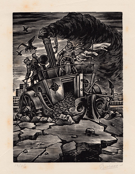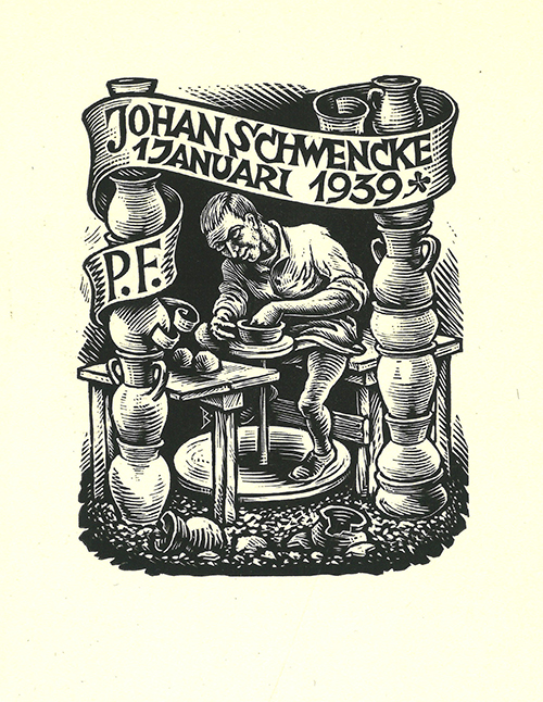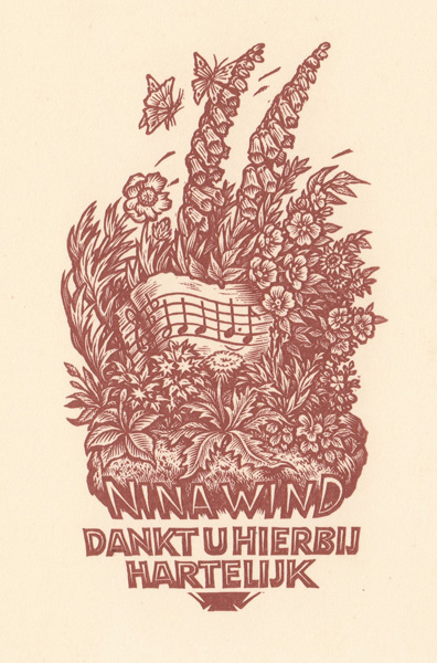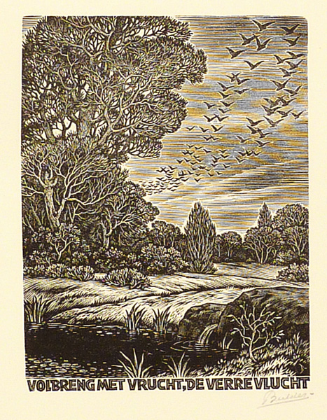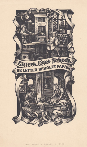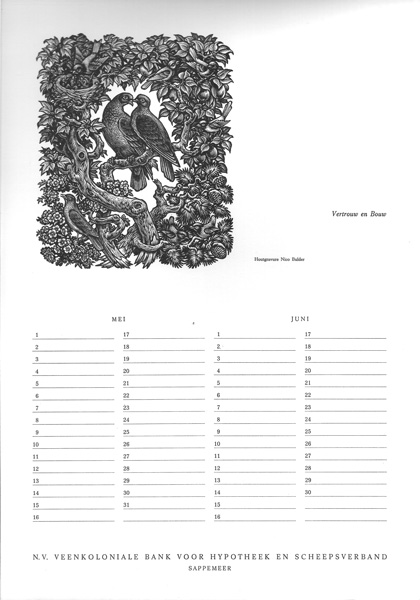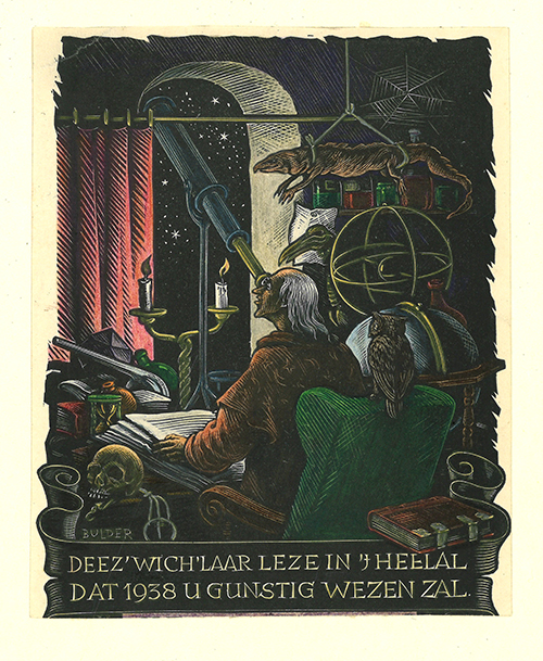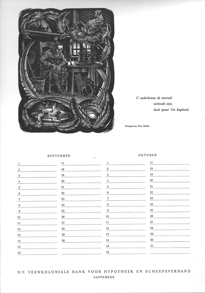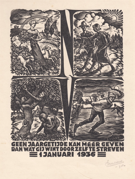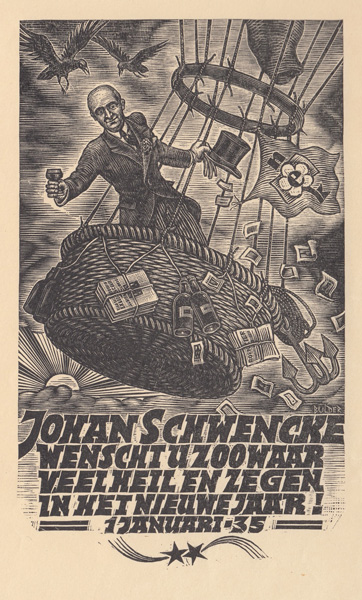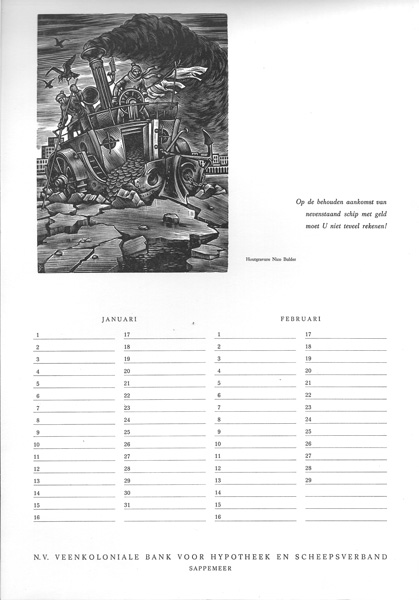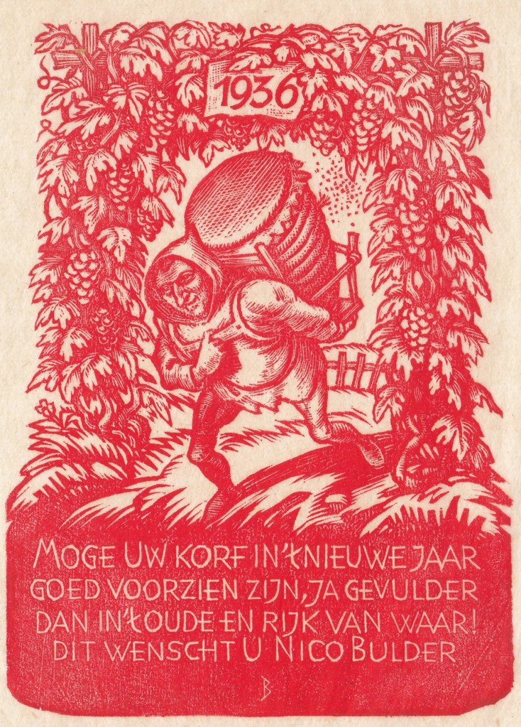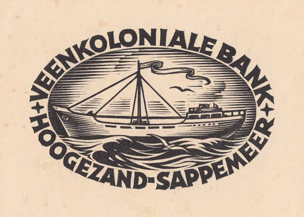 Nico Bulder created a lot of art for special occasions. His Christmas, Eastern and New Year’s cards especially radiate an unique exuberance. His own New Year’s cards are fun as well except for the 1939 one. Nico Bulder clearly had a bad premonition about the events that were about to unfold. The art that he made for the “Veenkoloniale Bank” is also worth your attention. The composition and level of detail are astounding for a wood engraving.