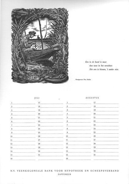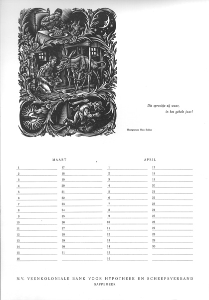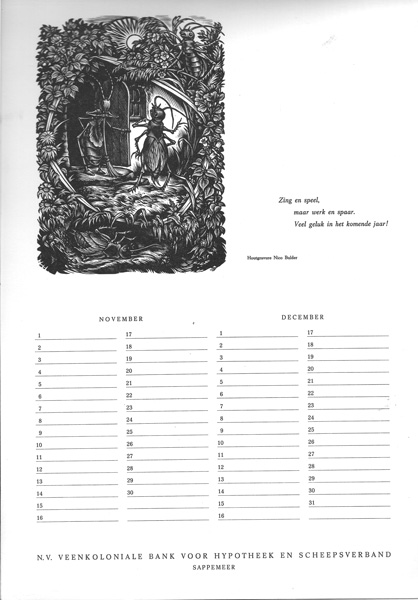 1955: 1956 New Year’s card Veenkoloniale Bank, X2“The Wishing-Table, the Gold-Ass, and the Cudgel in the Sack” (“Tafeltje dek je, Ezeltje strek je en Knuppel uit de zak”), 1959 New Year’s card, X2, Collection Veenkoloniaal Museum Veendam (NL) – Click here for more info. “The Wishing-Table, the Gold-Ass, and the Cudgel in the Sack” (“Tafeltje dek je, Ezeltje strek je en Knuppel uit de zak”), 1959 New Year’s card, X2, Collection Veenkoloniaal Museum Veendam (NL) – Click here for more info. Collection Veenkoloniaal Museum Veendam (NL)The Cricket and the Ant” (“De Krekel en de Mier naar La Fontaine”) –Collection Veenkoloniaal Museum Veendam (NL) – Click here for more info.The Cricket and the Ant” (“De Krekel en de Mier naar La Fontaine”) –Collection Veenkoloniaal Museum Veendam (NL) – Click here for more info.1961 New Year’s card for “Veenkoloniale Bank” referring to La Fontaine’s fable: The Fish and the Fisherman.Birthday calendarBirthday calendarBirthday calendarBirthday calendarBirthday calendarBirthday calendarBirthday calendarCollection Veenkoloniaal Museum Veendam (NL)