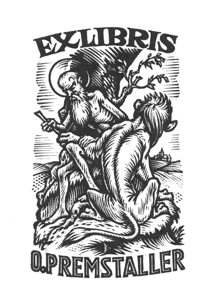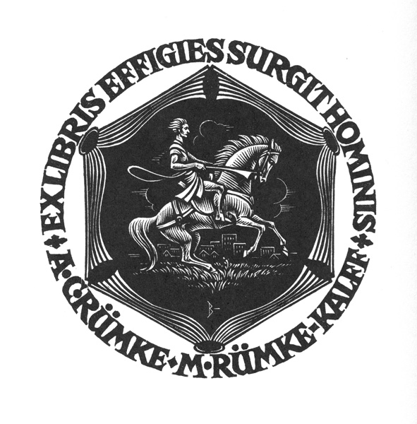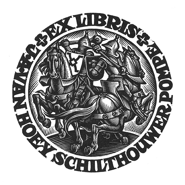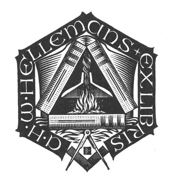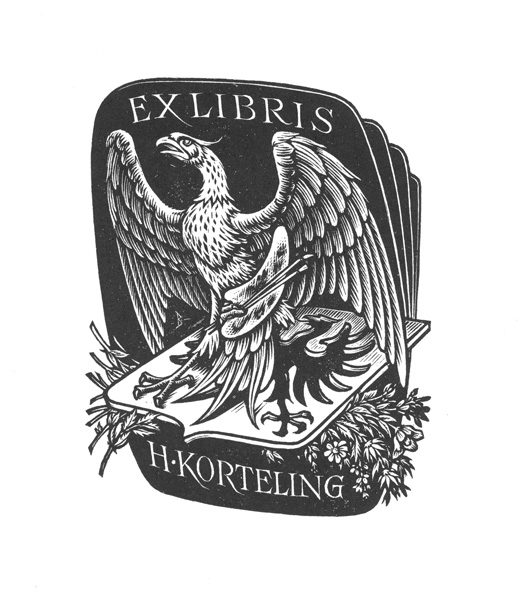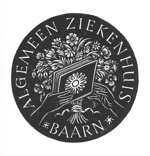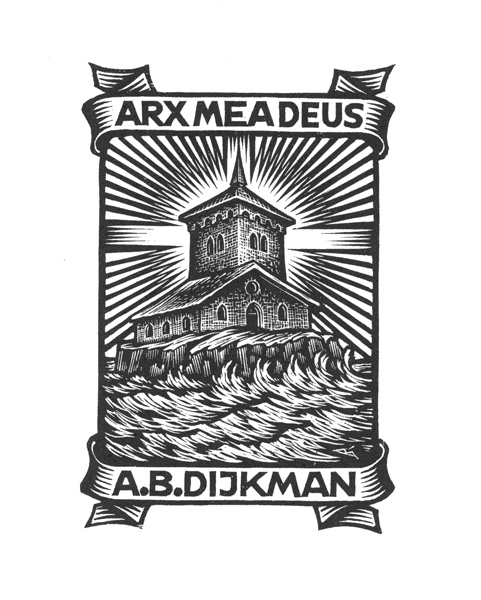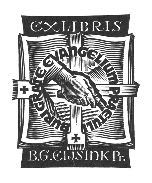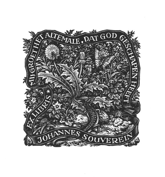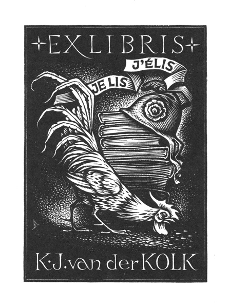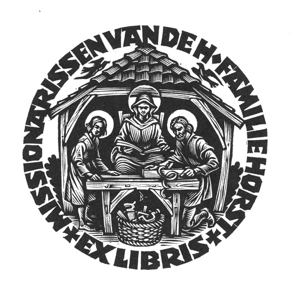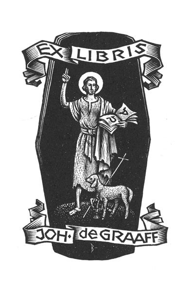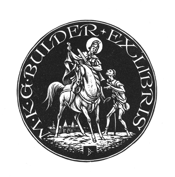 If you look closely to the opened book in the middle of the ex libris, you will recognize an illustration of St. George and the dragon, one of Nico Bulder’s favorite subjects (see at various places in this online museum). St. George symbolizes the protector who fights the good fight. The dragon is said to represent paganism. You will see a heart behind a book; this heart, being the traditional symbol of love supposedly symbolizes the love for books in this case. Both the heart and book are pierced by a hand engraving tool, the burin or graver which obviously refers to Nico Bulder’s tool of choice for his art. Although the modern symbolism of a pierced heart (by Cupid’s arrow) is romantic love, this symbolism is not fitting here. Probably Nico Bulder refers to the much older symbolism of the heart of Jesus.