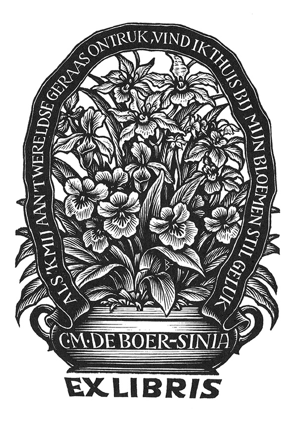 Opus 167 (1963) Design for Lou Asperslag; not finished due to Nico Bulder passing away.Opus 166 (1962) Mr. J.C. Wilhelmy van Hasselt (Directeur van de Nederlandse Spoorwegen, schoonzoon van C.H. Beels)Opus 165 (1962) Evert Musch, Academie Minerva colleague, painter and best friend of Nico Bulder. Symbolism explanation: “nature” Evert Musch loved nature, lived in the middle of it; “Frans Hals portrait in the middle” Evert Musch was an art collector with a special admiration for Adriaen van Ostade, one of the Frans Hals students; “sparrow bird” called “mus” in Dutch relates of course to Evert Musch’s name, but also refers to his slightly mischievous nature. The sparrow is sometimes also called “kwajongen” which translates as “mischievous boy” in Dutch.Opus 164 (1962) K.D. Poll & J. ArendsOpus 163 (1962) Lou Asperslag (Drukker-typograaf in Belgie) (See also Opus 167)Opus 162 (1962) A.J. SwartOpus 161 (1962), X2, G.B. which stands for Geziena Bulder also known as “tante Sien or Sienie”. She was the down-to earth cousin of Nico Bulder who managed his household. When Nico asked her what kind of ex-libris he should make for her, she answered “just make something with some flowers” the result of which you see here.Opus 160 (1962) Joh. de Graaff (Kapelaan in Hoogezand, later pastoor in Belgie, overleden in 1999)Opus 159 (1962) C.H. Beels (bank directeur)Opus 158 (1962) P. Hiemstra, teacher at Academie MinervaOpus 157 (1962), X2, Johannes Souverein, antiquarian seller of ex libris and graphics who lived with his spouse Maria in Beek-Ubbergen near Nijmegen, was regular visitor of Nico BulderOpus 156 (1962), X2, Netty Edzes; she was director of the Nuts library in Hoogezand and a good friend of Nico Bulder and Rens Boon. Note that the “Y” is mirrored.Opus 155 (1962), X2, R. Doornbos, farmer’s son born on Feb 1st, 1927 in Hoogezand, graduated in mathematics, worked as a statistician for Unilver in Rotterdam. His hobby was sailing.Opus 154 (1962), X2, Mr. G. N. Schutter, historian and archivist who worked for the Groningen province. Author of multiple books including “De oudste generatie Berg” about one of the families in Hoogezand who was engaged in the peat removal.Opus 153 (1961), X2, H. Korteling, student of Nico Bulder, retired high school teacher, lived in Roden.Opus 152 (1961), X2, Kea Homan, grafica and student of NB; see also “Memories of Kea Homan”.Opus 151 (1961), X2, A. van de Tol. He lived in The Hage and worked at the department of Art, Science & Education.Opus 150 (1960), X2, C. M. de Boer-Sinia. She was the spouse of Dr. de Boer (Opus 147 & 148). The ex libris letters were engraved on a separate block. The illustration of the ex libris could thus also be used for other graphical purposes.Opus 149 (1960), X2, J. Spakman, former director of publishing house “De Librije”Opus 148 (1960), X2, Dr. Julius de Boer, primary care doctor in Zeist, wrote the book “Arthur Rimbaud” which included a Nico Bulder wood engraving. This ex libris is the corrected version of the rejected Opus 147.Opus 147 (1960), X2, Dr. Julius de Boer, primary care doctor in Zeist, wrote the book “Arthur Rimbaud” which included a Nico Bulder wood engraving. This ex libris was rejected by Nico Bulder himself.Opus 146 (1959), X2, T. Albronda, former director of the Veenkoloniale BankOpus 145, (1959), X2, Nina Wind, she was a concert singer living in The Hague.Opus 144 (1959), X2, L. Geerlandt. We don’t know much about her, but she must have been a lady equestrian who also liked to play golf.Opus 143 ((1958), X2, ‘t Speelske Hus, Willem Valk’s house at Terschelling.Opus 142 ( 1958), X2, J en G. Pronk, illustrator in Amsterdam and engaged with a girl from Groningen; he had this ex libris made as an engagement present.Opus 141 (1958), X2, Algemeen Ziekenhuis Baarn (General Hospital in Baarn, The Netherlands)Opus 140 (1958), X2, N.G. Addens, born in 1892, farmer in Bellingwolde from 1921-1945, Board member of the “Groninger Maatschappij van Landbouw”, chairman of the supervisory board of the “Friesch-Groninger Coop. Beetwortel-Suikerfabriek, board member of the “Landbouw Economisch Instituut” from 1941-1949, authored several articles.Opus 139 (1958), X2, Mr. D. Giltay Veth, attorney and judge who lived most of the time in Amsterdam, was one of the co-authors of the infamous “Weinreb rapport”, same as Opus 137 and Opus 24.Opus 138A (1957), X2, M.A. Beels, founder of the “KOG Stichting” and one of the founders of the “Koninklijke Oudheidkunde”, notary in Haarlem, board member of the “Burgerweeshuis” and Grand Master of the Freemasons.Opus 138 (1957), X2, C.H. Beels, bank director, his collection was donated to the “Museum van het Boek”.Opus 137 (1957), X2, Mr. D. Giltay Veth, attorney and judge who lived most of the time in Amsterdam, was one of the co-authors of the infamous “Weinreb rapport”, same as Opus 139 and Opus 24.Opus 136 (1957), X2, F.A. Möller, born in 1899 in Enschede, became director of the “Scholtens Chemische Fabrieken” in Groningen in 1937, became also director of the “Scholtens Aaardappelmeelfabrieken” and “Meihuizen-Boons fabrieken” in 1943, lived in Zuidlaren.Opus 135 (1957), X2, A.C. Rümke and M. Rümke-Kalf, couple lived in Utrecht, he was a psychologist.Opus 134 (1957), X2, Frantz van Dorpe, born May 20, 1906 in Kortrijk and passed away on May 14, 1990 in St. Niklaas, Belgian industrialist, MP for the CVP party and mayor of St. Niklaas.Opus 133 (1957), X2, A.B. Dijkman, this ex libris is a correction of Opus 132 in which the wrong initials were used.Opus 132 (1957), X2, J.A. Dijkman, this ex libris has the wrong initials; to correct this Opus 133 was made.Opus 131 (1957), X2, S. Pilkes, worked in the telecommunications industry. The original ex libris lacks Nico Bulder’s monogram, but interestingly the publication “Nieuwere Exlibris van Nico Bulder” published in 1959 by “Arethusa Pers”