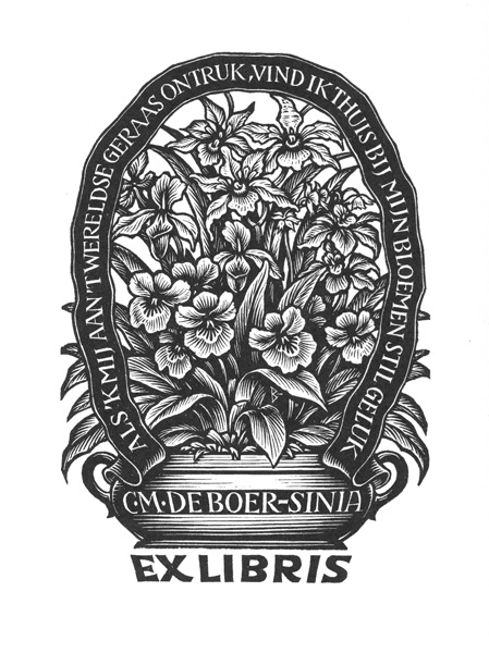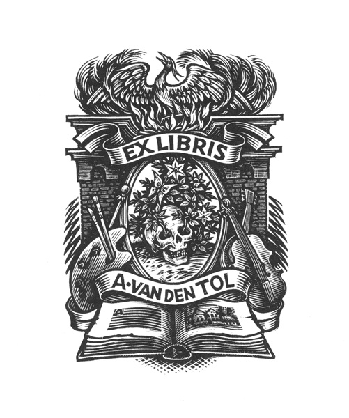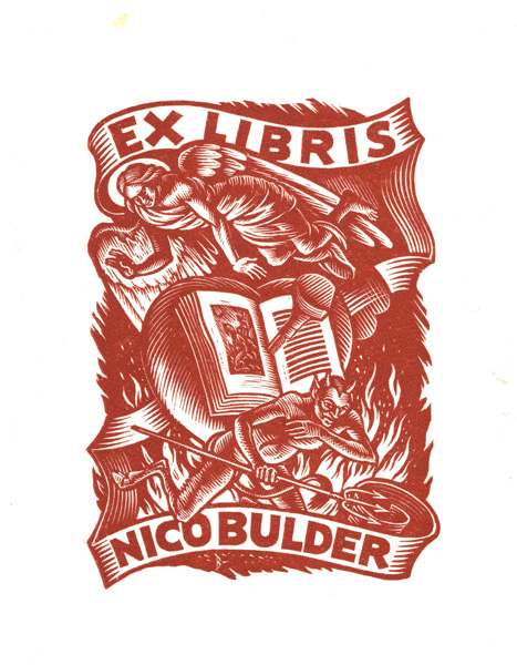 Here is his latest ex libris, Opus 75 (from 1943). According to Evert Musch, Nico Bulder once told him the meaning of this ex libris: “duivels werk met engelen geduld uit het hart van de eigenaar”. Although “duivel” is the Dutch word for “devil”, “duivels werk” has less to do with the devil himself, but refers more to a tremendous amount of work. Similar reasoning applies to the angels: although “engel” is the Dutch word for “angel”, “engelen geduld” means an almost infinite amount of patience, something an engraver like Nico Bulder would definitely need.