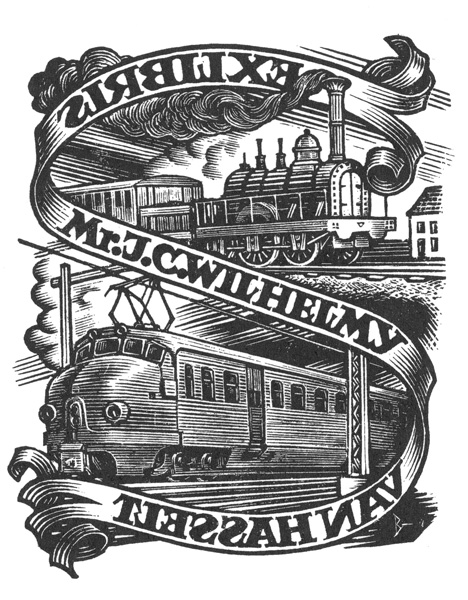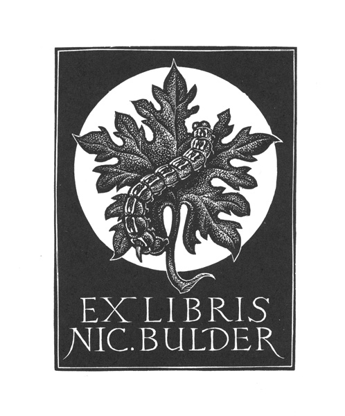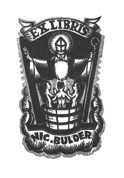 Opus 110 (1946), X2, Dr. G. Stoel, primary care doctor in DirkslandOpus 108, 1946, X2, M. van Lokeren Campagne – de Haas; born on Jan 24 1899, she married Jan van Lokeren Campagne (born on Sep 9 1894 in Klater, Indonesia); he was pediatrician and professor in pediatric medicine. They lived in Oegstgeest, Groningen and Bussum.Opus 109 (1946), X2, Dr. Marie H. van der Zeyde, Click here for more infoOpus 107, 1946, X2, Ir. D. Douwes; he was director at the Carbid factory in Amsterdam, later director at Scholten-Honig.Opus 106, 1946, X2, B.J.H. Dijkhuizen; he was director at “Vermande en Zonen”.Opus 105, 1946, X2, A.G. Gerritsen; he was a friend of H.M. Werkman and chemist at the VAM in Wijster, later he started an antique shop in Nijmegen.Opus 104, 1946, J.A. Mulder, wine merchant in SappemeerOpus 103, 1946, X2, Alida E. de Wit; she was the daughter of Mr. de Wit, director of Academie Minerva in Groningen.Opus 102, 1946, X2, H.T.J. Reinders; he was a farmer in Hoogezand.Opus 101, 1946, X2, Dr. J. Broekmeijer; born in 1887, he was an internal medicine specialist and director of the Dordrecht hospital from 1926 to 1950.Opus 100 (1945), X2, Ir H.G.J. Schelling, brother of # 28/38, architect for the Dutch Railways and involved in a.o. the design of the Amstel station in Amsterdam.Opus 75, 1943, X2, Nico BulderOpus 75, 1943, X2 printed in red, Nico BulderOpus 67, 1942, X2, Dr. K. Bos, the forest in the ex libris refers to the family name (the Dutch word “bos” means “forest”), the eye refers to the doctor’s specialty being an ophthalmologist, while the picture inside the eye shows a medieval “steensnijder”(= “barbar-surgeon”) whose profession developed into the modern day surgeon.Opus 45 (1938), Nico Bulder, X2, showing a caterpillar eating a leaf. Caterpillars spend their days rolled up in a leaf to hide from birds and other predators and come out at night to feed on the leaves of the plant. (The leaf rolling mechanism is one of those amazing feats of natural engineering that’s both simple and effective). It appears that Nico Bulder felt a lot of similarity with those caterpillars. He worked mostly in the evening and at night to satisfy his demanding customers, for hours cutting in the hard wood just like a caterpillar devouring the hardy leaves with its strong jaws. But as a result of all the hard work a beautiful piece of graphical art would emerge just like the caterpillar who would eventually turn into a beautiful butterfly.Opus 38 (1937), X2, Ir. A.H. Schelling, waterbouwkundig ingenieur who was involved with the design and realization of the Starkenborgh channel and Oostersluis lock in Groningen; see also Opus 28.Opus 28 (1936), X2, Ir. A.H. Schelling, waterbouwkundig ingenieur who was involved with the design and realization of the Starkenborgh channel and Oostersluis lock in Groningen. see also Opus 38.Opus 12 (1932), Nico Bulder, X2, printed in two colors black and brown showing St. Nicholas of Myra. Numerous stories, some miraculous, are told about Nicholas. One tells how during a terrible famine, a malicious butcher lured three little children into his house, where he killed them, placing their remains in a barrel to cure, planning to sell them off as ham. Nicholas, visiting the region to care for the hungry, not only saw through the butcher’s horrific crime but also resurrected the three boys from the barrel by his prayers. Another version of this story, possibly formed around the 11th century, claims that the butcher’s victims were instead three clerks who wished to stay the night. The man murdered them, and was advised by his wife to dispose of them by turning them into meat pies. The saint saw through this and brought the men back to life. Why Nico Bulder chose this theme for his personal ex libris in 1932 is unknown.Opus “unnumbered” (1928), X1, Nico Bulder made this ex libris of the Slochteren tower as part of his final examination at “Academie Minerva”.