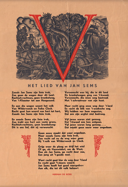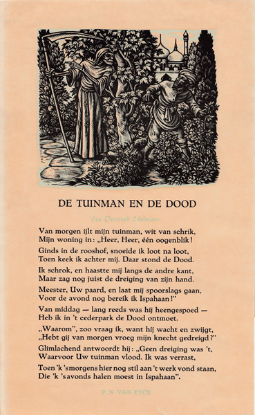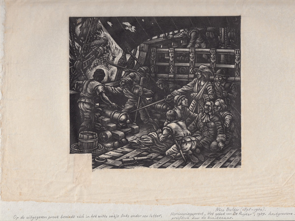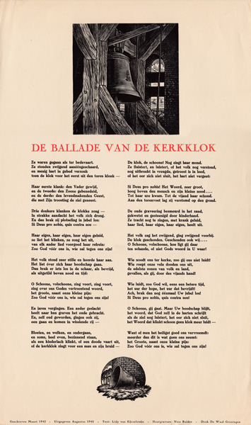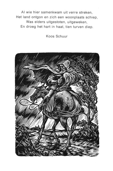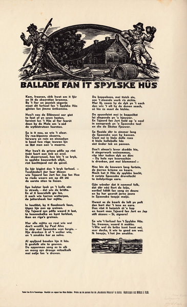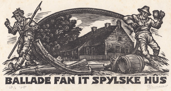 Koos Schuur poem. Click for more info.“ZUN, WIEND EN WOLKEN”, 1959, illustration to the volume of poems by Jan Boer, Uitgeverij J. Niemeijer, Groningen.Cover page of “ZUN, WIEND EN WOLKEN”, 1959, illustration to the volume of poems by Jan Boer, Uitgeverij J. Niemeijer, Groningen.Jan Sems’ Song (Lied van Jan Sems) by Herman de Boer, illustration by Nico Bulder, to understand the red “V” click here for more info.Ballade Fan It Spylske Hus; Spylske Hus was the vacation house on Terschelling island of Willem Valk, sculptor and Minerva colleague of Nico Bulder; author of the poem was D.A. Tamminga; poem was published in magazine “De Tsjerne” volume 10 issue 11 in 1955, X2, click here for more info.Poem header “It Spylske Hus” on Terschelling island; this was the vacation house of Willem Valk, sculptor and Minerva colleague of Nico Bulder; author of the poem was D.A. Tamminga; poem was published in magazine “De Tsjerne” volume 10 issue 11 in 1955, X2, click here for more info.Poem by Jan Boer (Rijmprent 1 Cor. 13 (Geloof, Hoop en Liefde), vertoald ien’t Hogelandster dialect door Jan Boer), illustration by Nico Bulder, for more info on Jan Boer, click here.Ballad of the Church Bell by Lidy van Eijsselstein, 1945 about the removal of the church bell of Haren in WWII. The inscription on the bell states “Si Deus Pro Nobis, Quis Contra Nos” (Latin: If God is for us, who can be against us!) – Click for more info.The Yard Man and The Death by P.N. van Eyk, 1926 – Click for more info.Prayer for admiral “de Ruyter”, 1939, wood engraving, proof print by Nico Bulder with sub text.Prayer for admiral “de Ruyter”, 1939, wood engraving, proof print by Nico Bulder. Note: he left the lower left corner white on purpose, see next picture with the actual prayer included.Prayer for admiral “de Ruyter”, 1939.